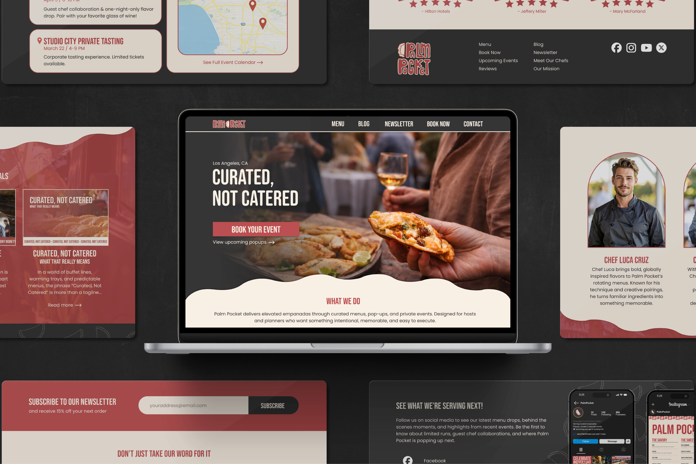 Palm Pocket is a modern empanada concept centered around curated food experiences for events, pop-ups, and private gatherings. This project focused on developing a cohesive brand and digital presence that supports both storytelling and event booking. The work includes a full visual system applied across web, social, and email marketing, with an emphasis on creating a consistent, engaging experience across every touchpoint.