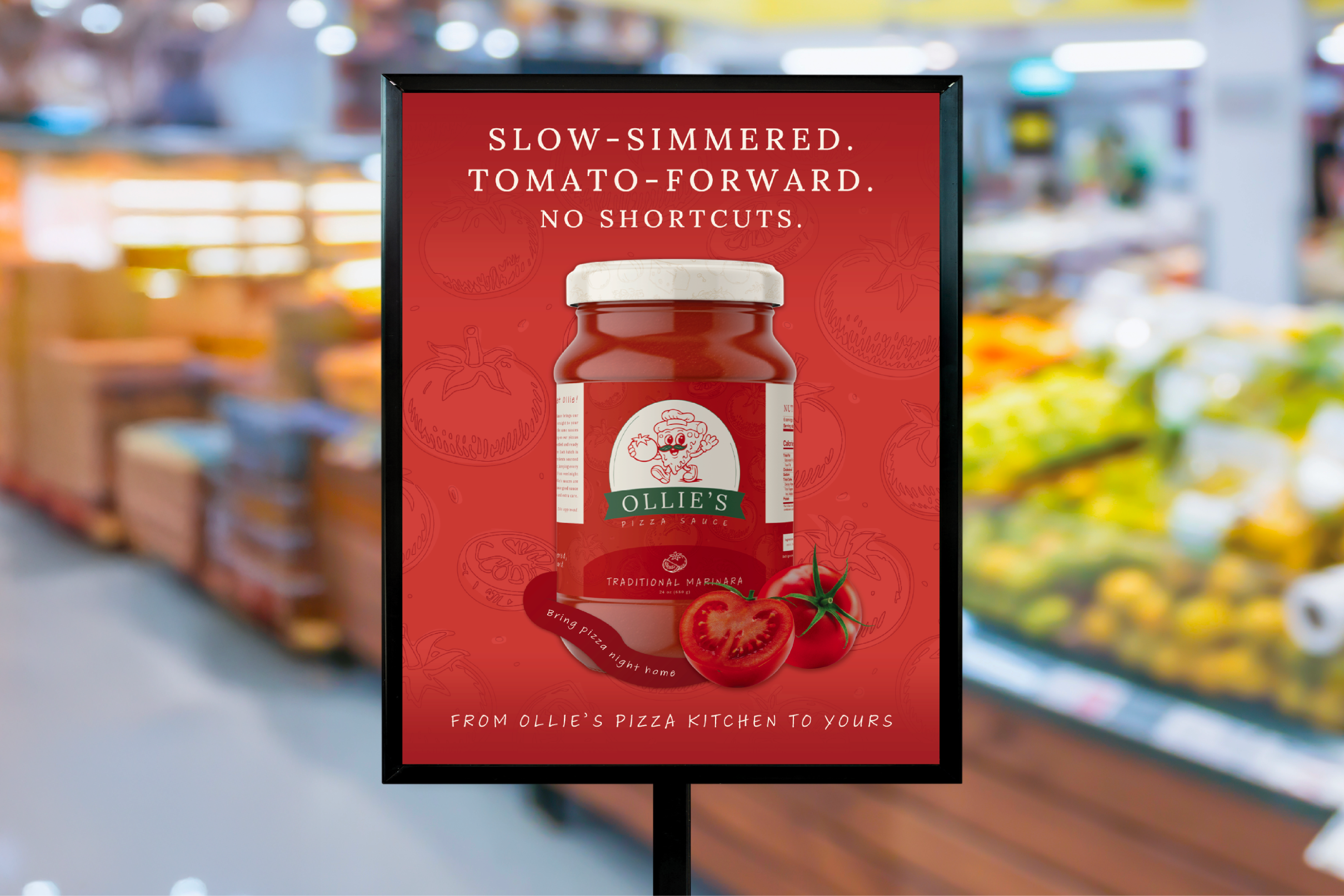 Ollie’s Pizza Sauce is a brand inspired by the warmth and tradition of a neighborhood pizza kitchen. This project focused on creating a cohesive identity that translates from packaging to advertising in print. Through hand-drawn illustrations, ingredient-inspired colors, and approachable typography, the brand was designed to feel nostalgic, playful, and authentic.