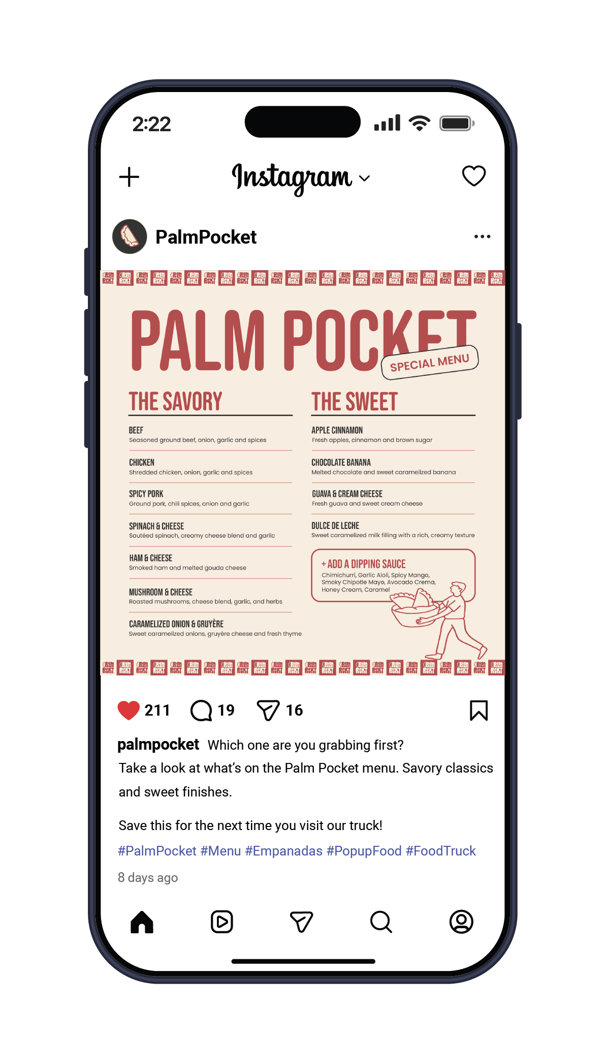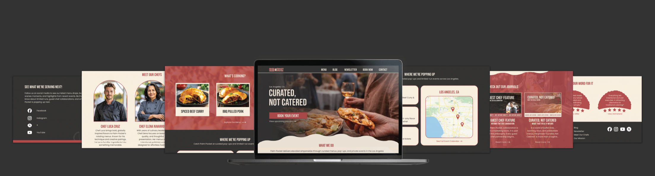 The blog expands Palm Pocket beyond the menu, offering event inspiration, behind-the-scenes content, and curated ideas. Each article uses thoughtful hierarchy, strong visuals, and scannable layouts to create an engaging reading experience. Designing these pages helped me explore how content structure and visual rhythm can keep users engaged while supporting the brand’s voice.