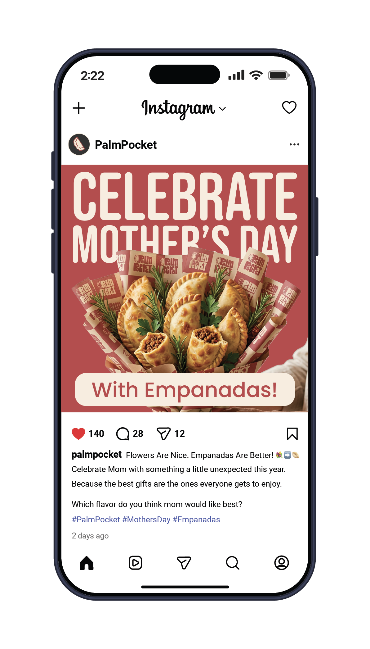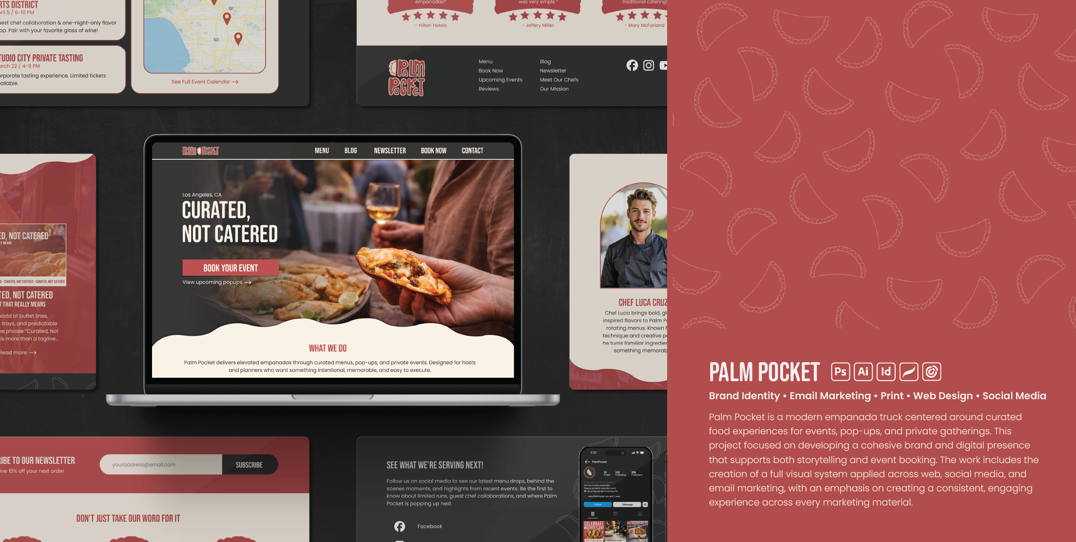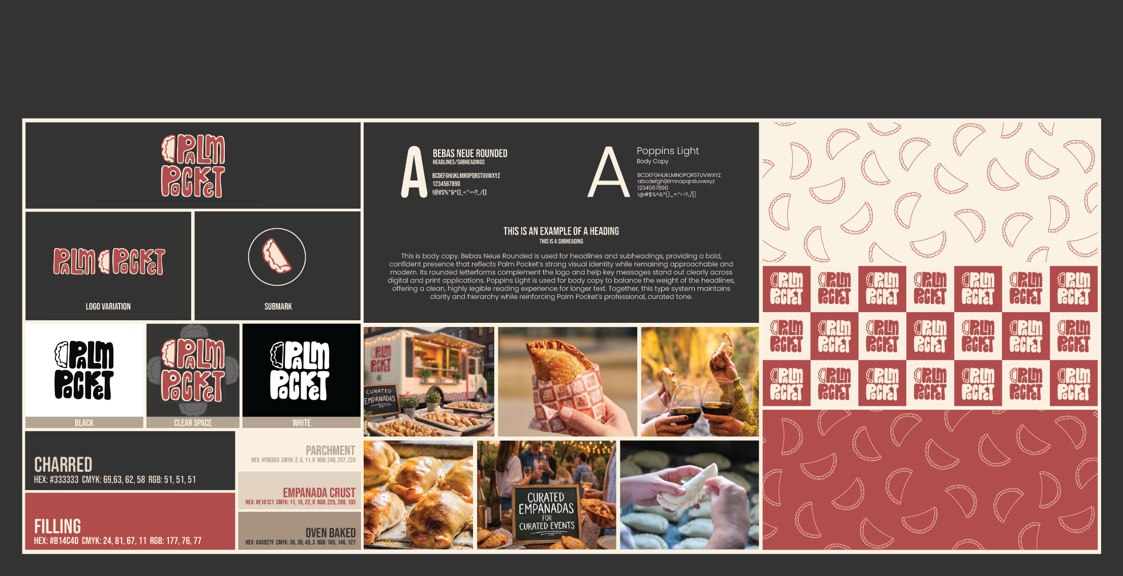 The brand identity was designed to feel bold, playful, and easily recognizable. I developed a custom logo, submark, and illustrated elements inspired by the shape and texture of empanadas. A warm, food-inspired color palette paired with rounded, expressive typography creates a friendly and inviting tone while maintaining strong visual consistency. Through this process, I learned how thoughtful visual systems can balance personality with clarity to create a memorable and cohesive brand.
