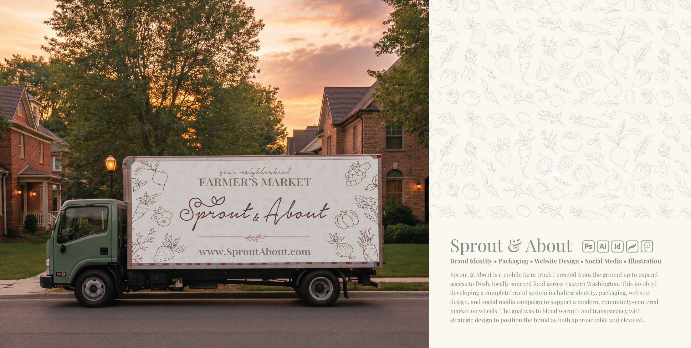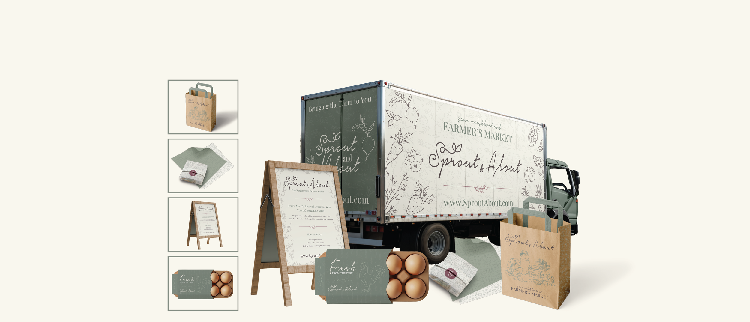 The truck graphics and supporting materials extend the Sprout & About brand system into physical applications. Consistent hand-drawn illustrations, typography, and color palette create a cohesive and inviting mobile market experience. This stage highlighted how maintaining visual consistency across different formats helps build recognition and creates a strong, memorable brand presence.